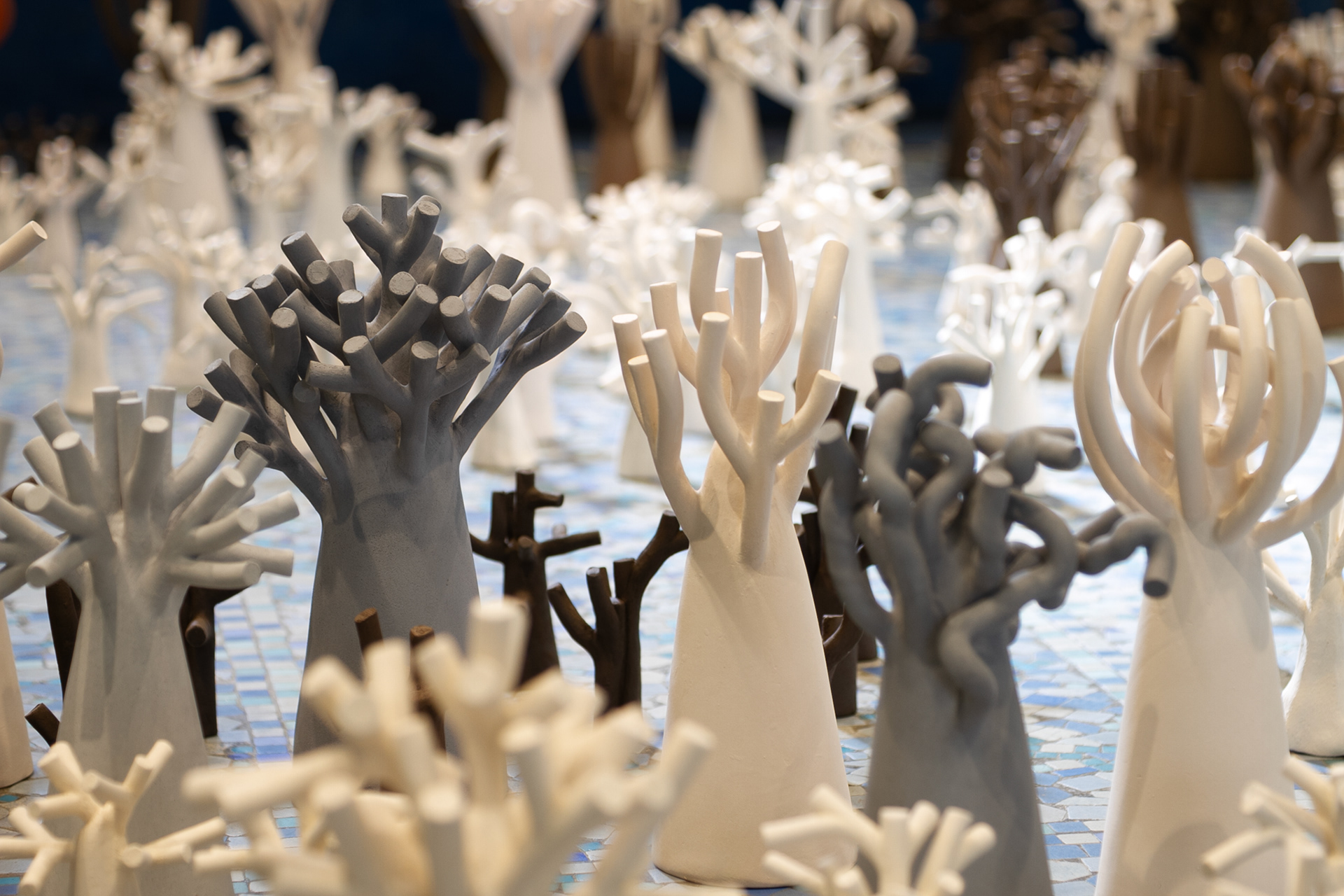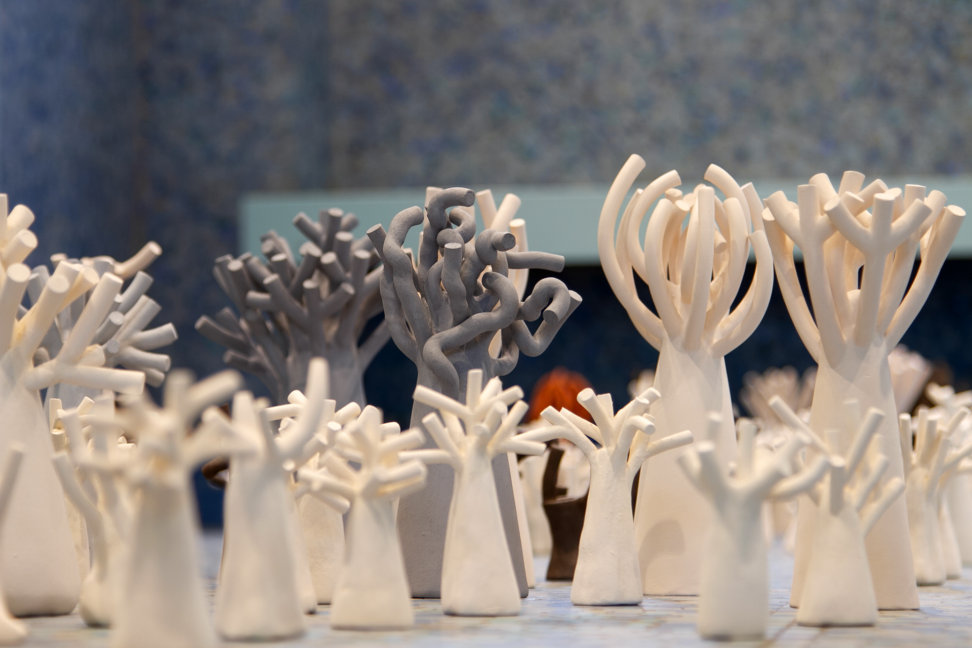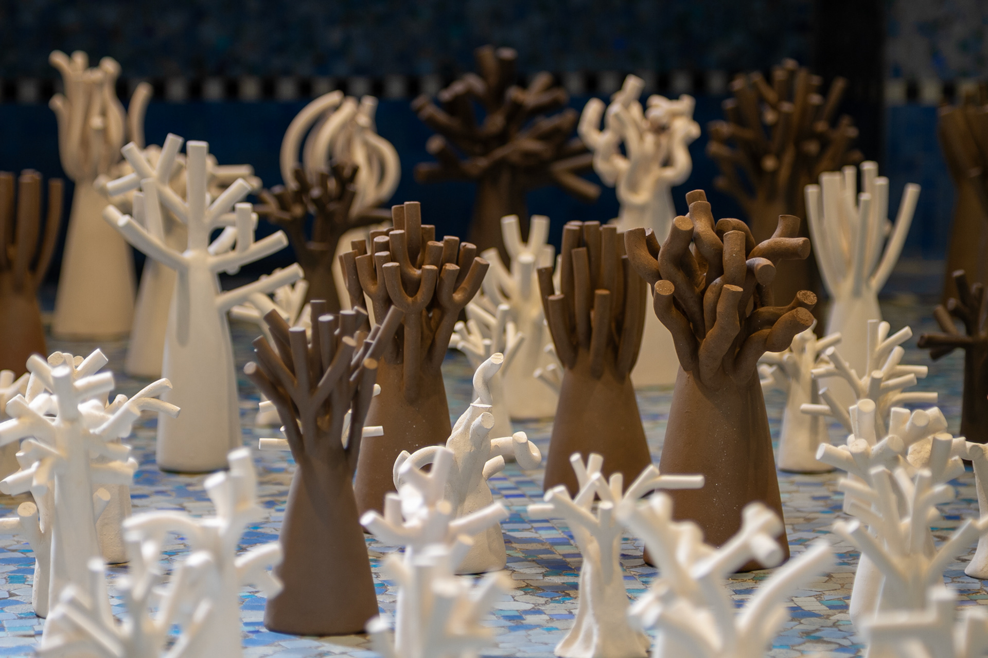 La « forêt fossilisée » est une forêt miniature sculptée en argile. Chaque arbre évoque une présence à la fois tangible et évanescente, comme figée dans le temps.