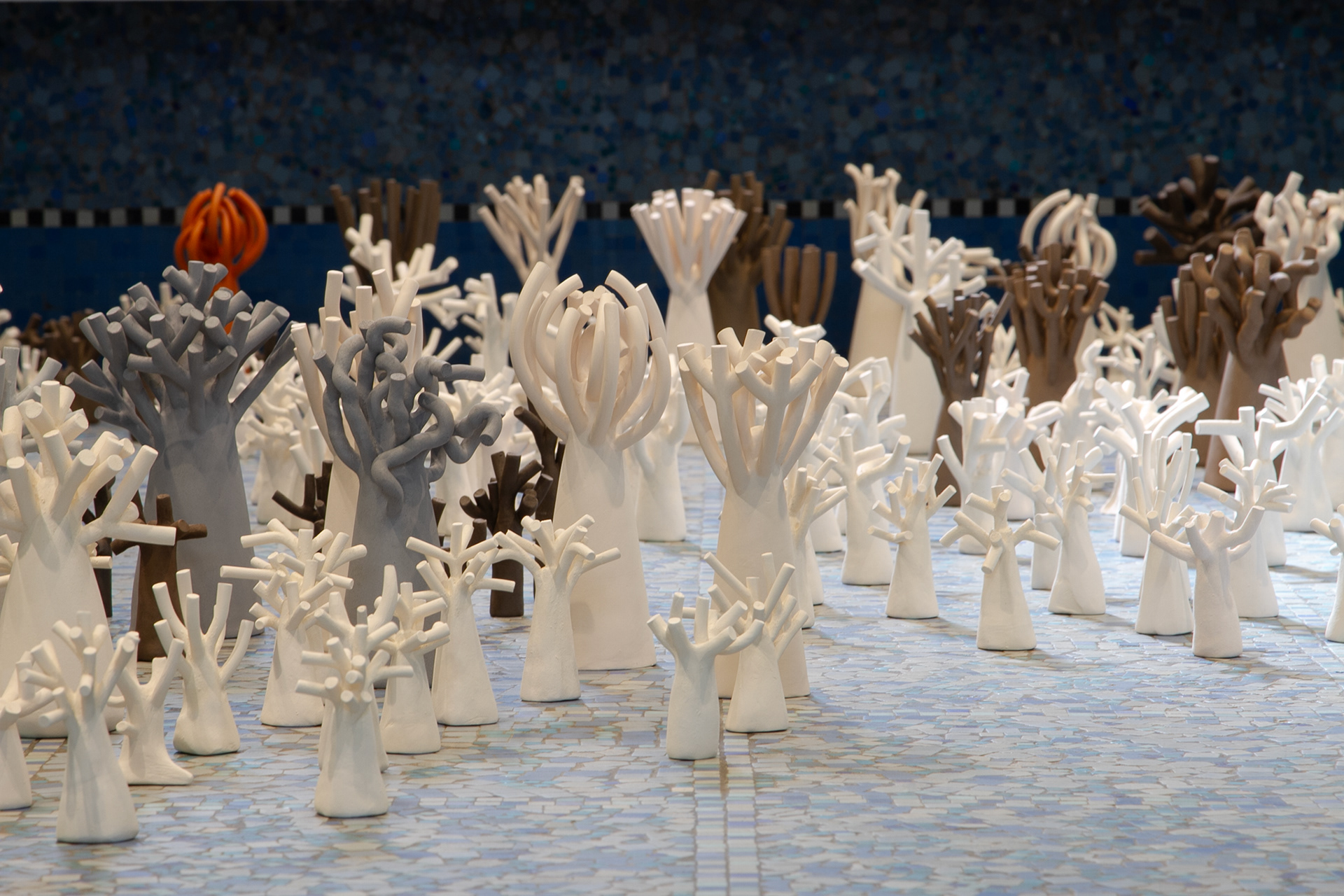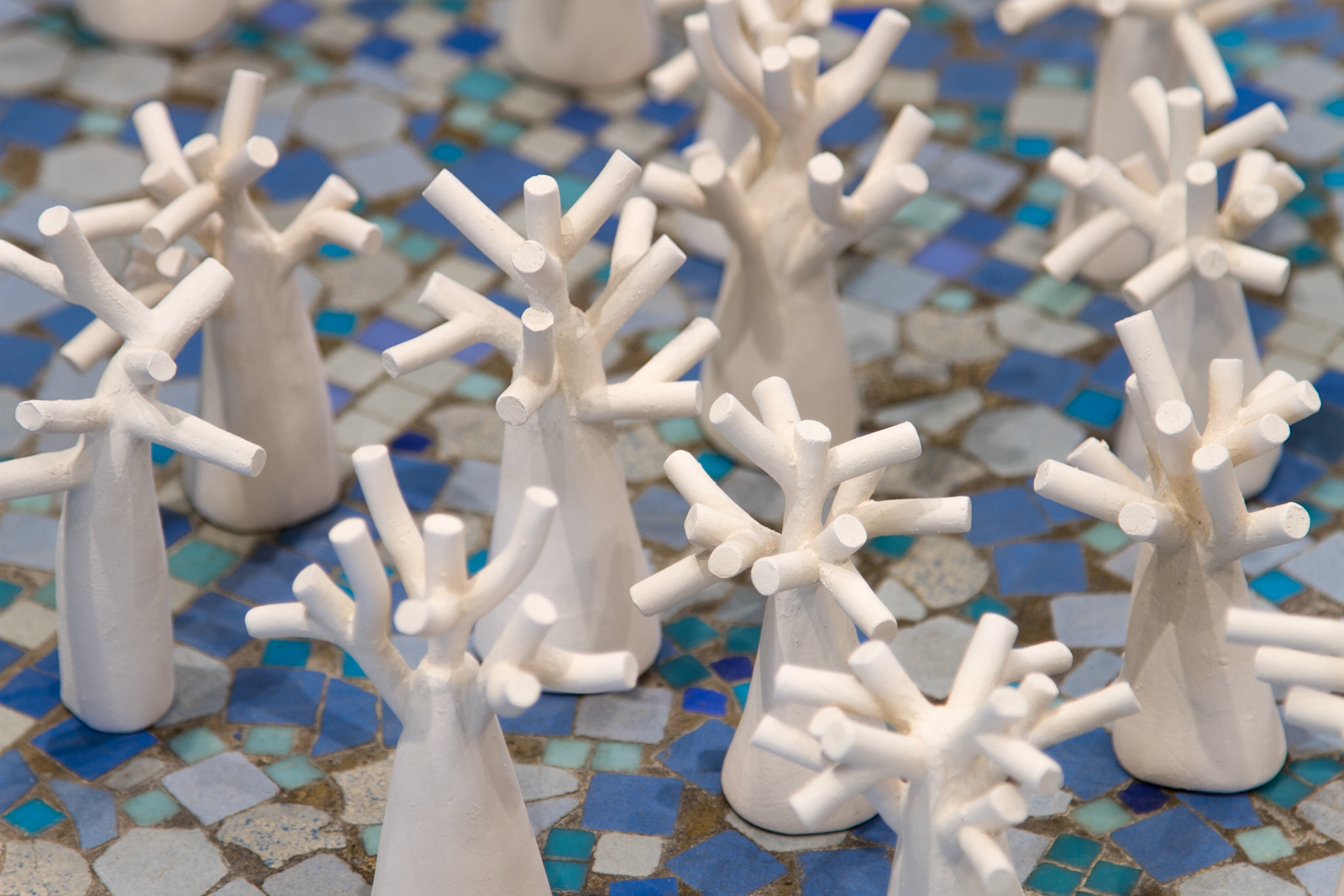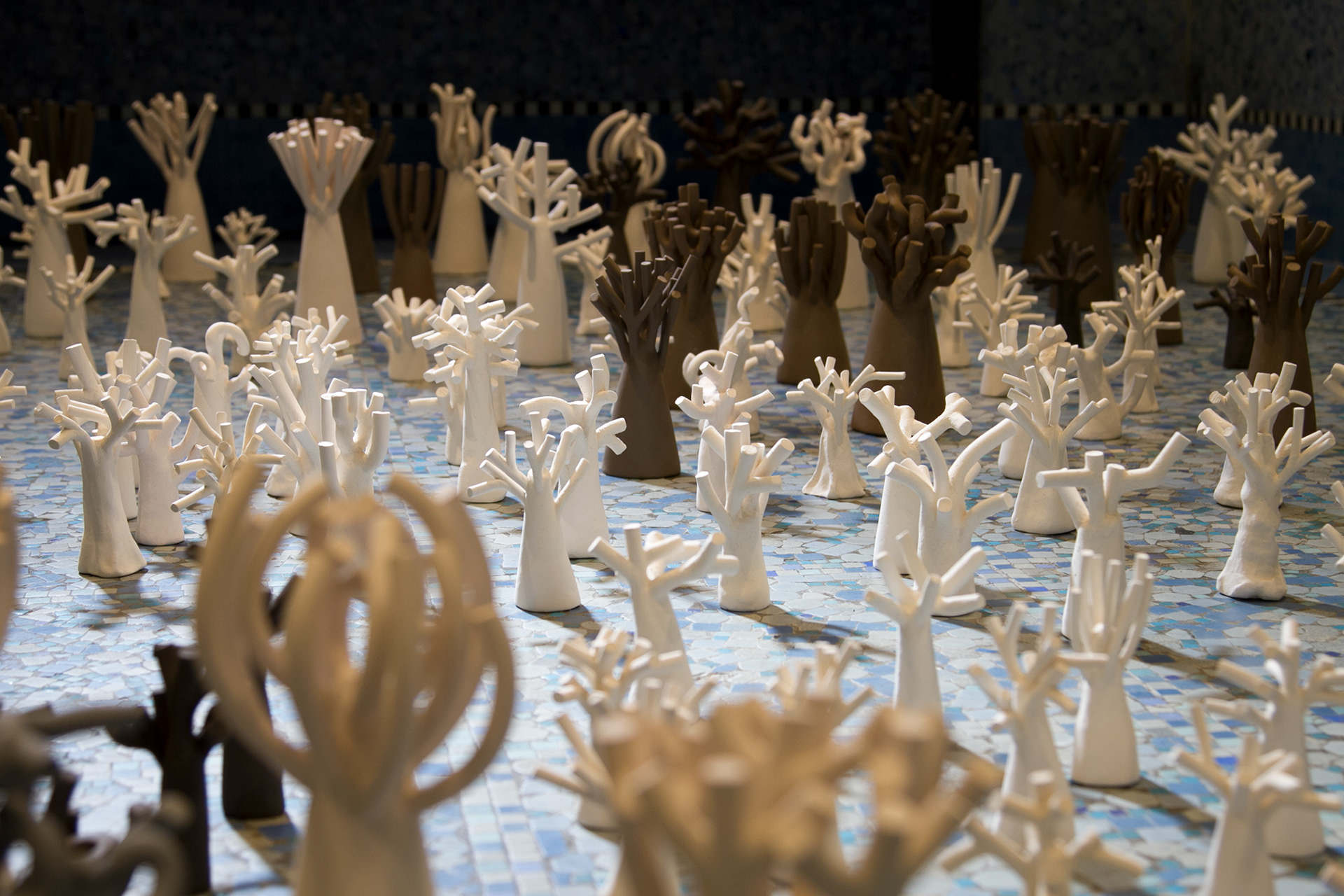La « forêt fossilisée » est une forêt miniature sculptée en argile. Chaque arbre évoque une présence à la fois tangible et évanescente, comme figée dans le temps.